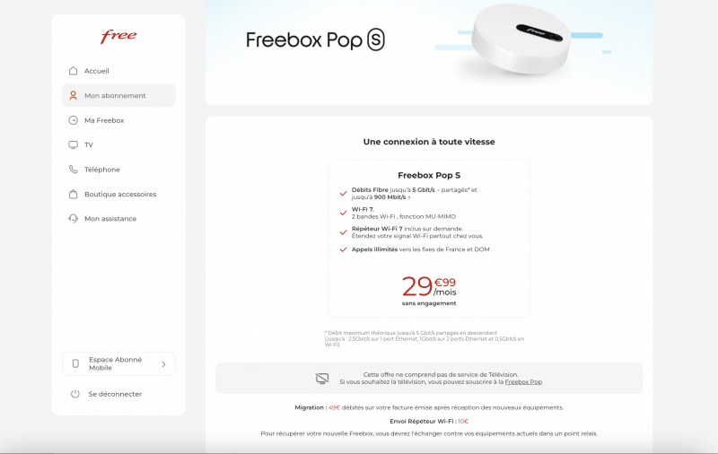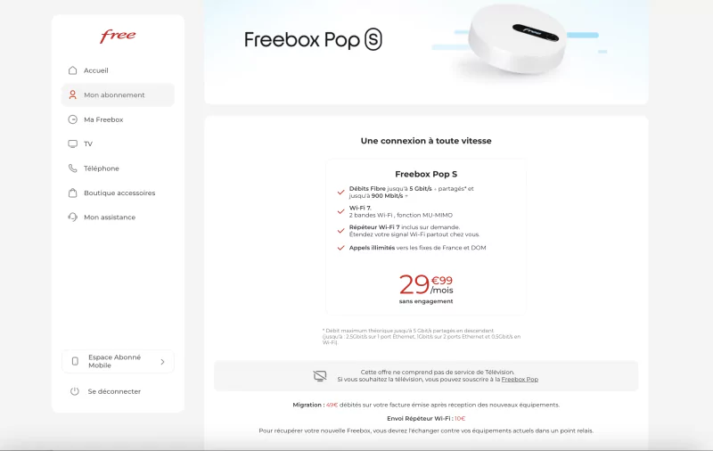 Outre le tarif de 29,99€/mois, les abonnés existants devront également s’acquitter de 49 € de frais de migration, débités sur la facture après réception des nouveaux équipements. À cela peut s’ajouter 10 € pour l’envoi du répéteur Wi-Fi 7, optionnel mais inclus sur demande.