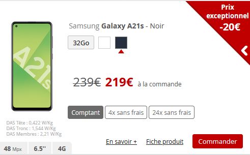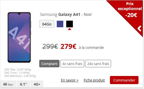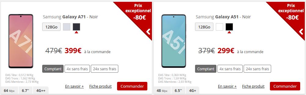 Le A51 quant à lui voit son prix baisser à 299€ au comptant, 77€ puis trois fois 74€ ou bien 107€ à la commande puis 24 fois 8€.