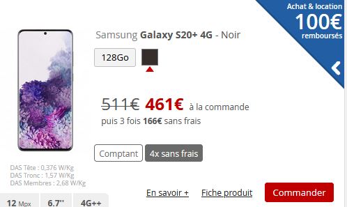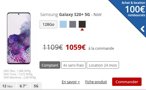 - Toute la gamme Samsung Galaxy S20 bénéficie d’une réduction de 50€, le tout couplé à une offre de remboursement de 100€.