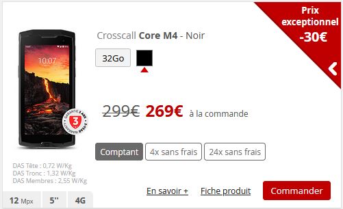 En dehors de ces trois gros fabricants, le Crosscall M4 propose lui aussi une promo de 30€, coûtant ainsi 269€. Il est possible d’opter pour un paiement échelonné, soit 68€ puis trois fois 67€, soit 77€ puis 24 fois 8€.