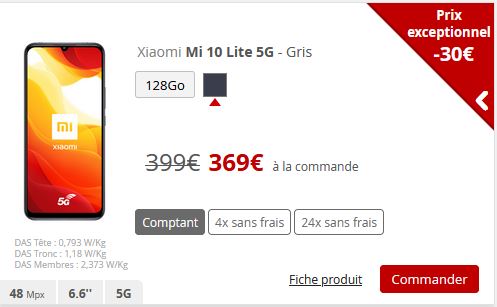 - Le Mi 10 Lite 5G voit son prix baisser de 30€, passant à 369€. Vous pouvez aussi opter pour un paiement en 4 fois , 93€ puis trois fois 92€, ou en 24 fois pour 177€ à la commande puis 24 fois 8€.