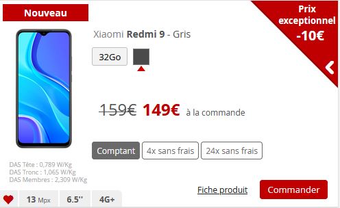 - Le Redmi 9 quant à lui bénéficie d’une remise de 10€, et coûtera 149€ au comptant. Pour un paiement en plusieurs fois, comptez 38€ puis trois fois 37€, ou 29€ puis 24 fois 5€.