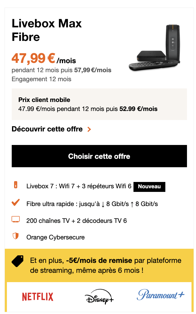 Six mois après avoir introduit une remise mensuelle de 5€ sur Netflix, Disney+ et Max pour ses abonnés Livebox Max, Orange revoit son avantage en y ajoutant Paramount+ à la place du service de SVOD de Warner Bros. Discovery.