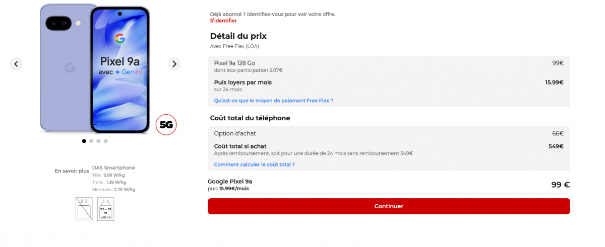 Le Pixel 9a Iris 128 Go est proposé à 549 €. Les clients ont la possibilité de régler ce montant en une seule fois ou d’opter pour un paiement échelonné via l’option Free Flex, avec 99 € à la commande, suivis de 15,99 €/mois pendant 24 mois, avec une option d’achat de 66 € à la fin de la période. De plus, un bonus de reprise de 150 € est offert pour l’échange d’un ancien smartphone.