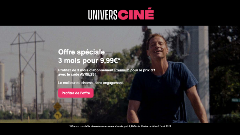 UniversCiné propose une nouvelle offre attractive à destination des amoureux du 7e art du 16 au 21 avril 2025 : 3 mois d’abonnement Premium pour le prix d’un, soit 9,99 € seulement, avec le code promo AVRIL25. Une initiative destinée à séduire de nouveaux abonnés, alors que la plateforme renforce son catalogue indépendant et d’auteur.