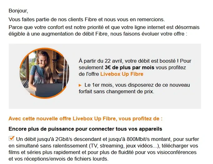 Des abonnés fibre équipés d’une Livebox Play reçoivent actuellement un mail pour les informer d’une évolution de leur offre : ils passent à la Livebox Up Fibre plus rapide, et devront payer 3€ de plus par mois.