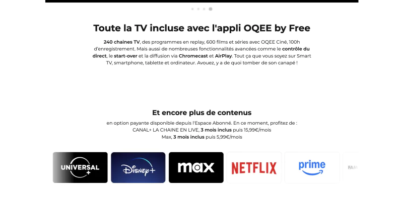 L’opérateur permet dans son offre Box 5G d’accéder à 240 chaines TV via Oqee by Free sur smart TV, smartphones, tablettes, ordinateurs, en direct et en replay et à plus de 600 films et séries inclus avec OQEE Ciné. Par ailleurs, 100h d’enregistrement sont incluses aussi de nombreuses fonctionnalités avancées comme le contrôle du direct, le start-over et la diffusion via Chromecast et AirPlay. L’application Oqee ne donne toutefois pas accès aux chaînes Canal+.