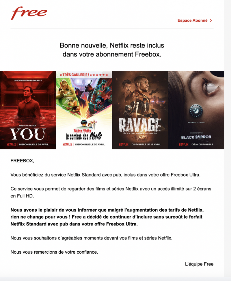 « Nous avons le plaisir de vous informer que malgré l’augmentation des tarifs de Netflix, rien ne change pour vous ! Free a décidé de continuer d’inclure sans surcoût le forfait Netflix Standard avec pub dans votre offre Freebox Ultra », annonce l’opérateur dans sa communication, se félicitant de continuer à offrir ce service en l’état.