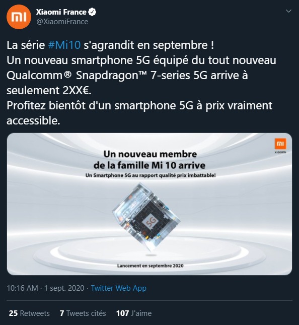 La marque a annoncé sur les réseaux sociaux, l’arrivée imminente d’un nouveau Mi 10 5G à moins de 300 euros qui sera disponible en France. L’appareil sera dévoilé au cours du mois de septembre.