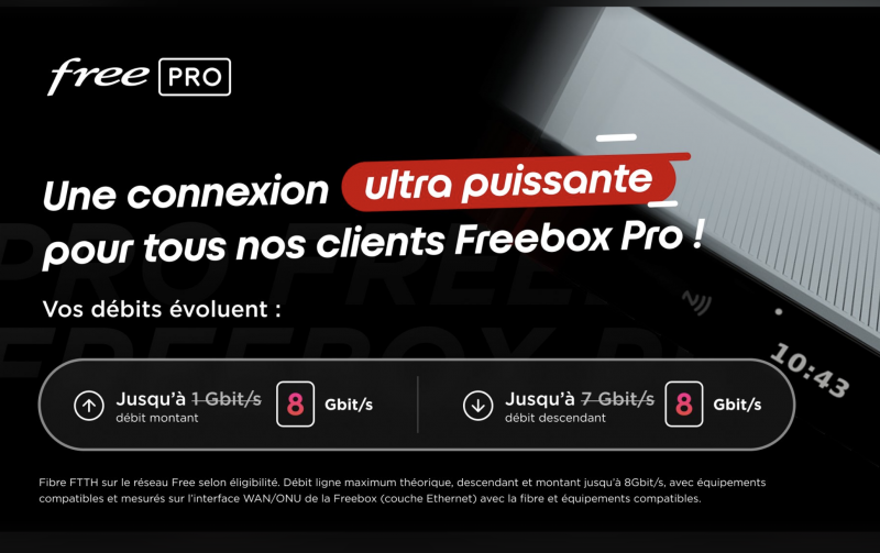 Free Pro frappe fort, sa 1ère Freebox passe automatiquement à 8 Gbit/s symétriques, tous ses clients en profitent sans surcoût