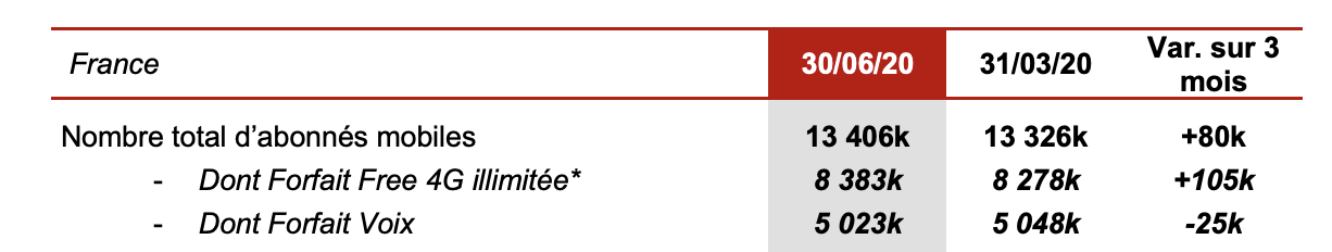 Si le chiffre d’affaire mobile est en hausse de 5,2% à 1,041 milliards d’euros au 1er semestre, il n’atteint que 0,7% au second trimestre. “La performance du mobile au deuxième trimestre a été impactée négativement par la crise COVID-19 à hauteur d’environ 20 millions d’euros”, indique sa maison-mère. Free se replace malgré tout dans la course sur ce segment.
