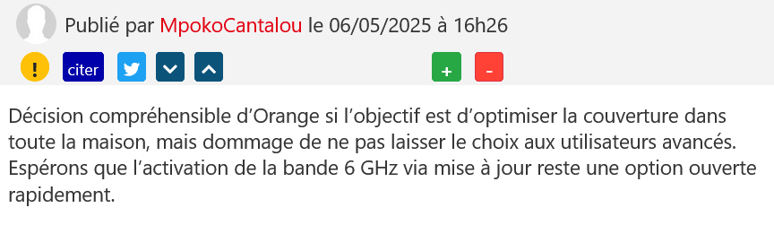 Orange justifie l’absence de la bande 6 GHz sur son Wi-Fi 7… mais n’exclut pas de revenir sur sa décision, affirmant qu’il est possible d’intégrer la bande 6 GHz sur sa Livebox 7. Mais pourquoi ne pas laisser simplement le choix de l’activer, plutôt que d’y empêcher l’accès complètement ?