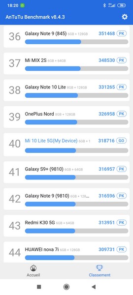 Côté benchmarks, l’outil AnTuTu positionne le Xiaomi Mi 10 Lite en dessous du OnePlus Nord doté du même chipset Qualcomm et au-dessus du Samsung Galaxy Note9, un ancien haut de gamme de fin 2018.