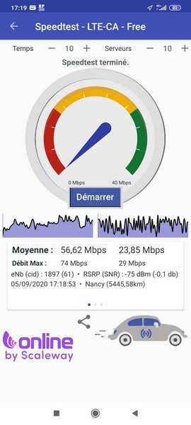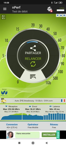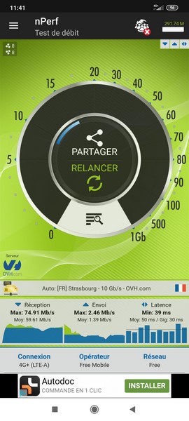 Le smartphone est compatible dual-SIM, avec deux logements SIM dans un tiroir de la tranche inférieure. Il fonctionne avec les réseaux 4G et 5G. Faute de réseau 5G au moment du test, nous n’avons pu tester que les débits en 4G, sur le réseau Free Mobile.