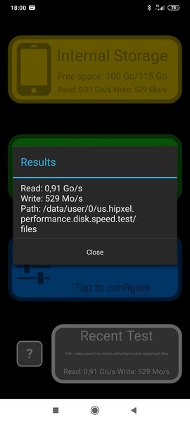 Disk Speed affichait quant à lui 529 Mo/s en écriture et 0,91 Go/s en lecture pour la mémoire interne. Voilà qui explique les installations et chargements rapides. D’ailleurs, pas d’extension par carte MicroSD au programme.