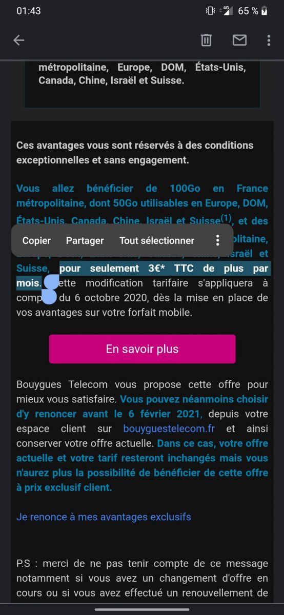 “Je n’ai jamais vu une embrouille aussi honteuse. Bouygues Telecom, vous cachez l’augmentation de 3€ de mon forfait dans les petites lettres au milieu d’un long paragraphe. Le bouton pour refuser ne ressemble même pas à un bouton”, colère et consternation pour cette abonnée B&You. Dans un courriel, Bouygues Telecom l’informe de l’arrivée prochaine de nouveaux services dans son offre, à avoir un passage à 100 Go de data par mois en France Métropolitaine soit un enrichissement de 30 Go, mais aussi 50 Go utilisables en roaming au lieu de 30 Go, sans oublier les appels illimités vers les fixes et mobiles de certaines destinations.