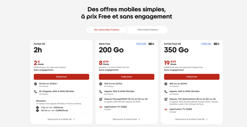 Ménage de printemps chez Free Mobile, l’opérateur vient d’apporter un coup de neuf à la page de présentation de ses offres mobiles sur son site internet. Un design remanié s’accompagne surtout d’une discrète mais significative nouveauté : la data à l’étranger est désormais indiquée comme accessible en 5G ou 4G, alors que seule la 4G était mentionnée jusqu’ici.