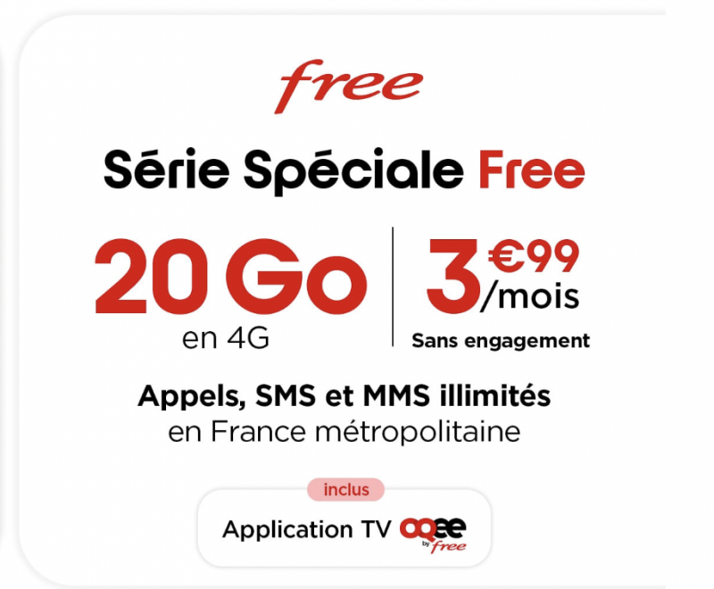 Disponible jusqu’au 3 juin, cette offre mobile change la donne. Incluant 20 Go de data en 4G (France métropolitaine), celle-ci est affichée à 3,99 €/mois sans condition de durée, avec appels, SMS/MMS illimités, 10 Go de roaming Europe/DOM mais pas seulement. Ce forfait inclut l’accès TV Oqee, à savoir l’application TV de l’opérateur qui donne accès à 240 chaînes incluses, de nombreux services de replay et plus de 500 films avec OQEE Ciné.