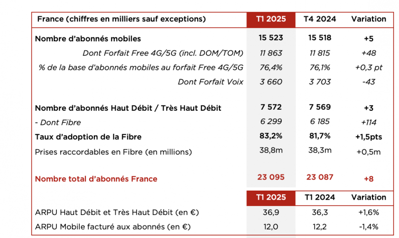 Free Mobile compte aujourd’hui 15,52 millions d’abonnés dont 76,4% disposent d’un forfait Série Free ou mobile Free 350 Go (illimité abonnés Freebox). L’ARPU Mobile facturé aux abonnés s’élève à 12€/mois, en baisse de 1,4% en un an, en raison de l’effet dilutif des offres convergentes, pour lesquelles la remise ne s’applique qu’au tarif mobile. “La dynamique du marché mobile français est également restée modeste au premier trimestre 2025”, concède l’opérateur qui pourrait peut-être se consoler avec les revenus des services mobiles facturés aux abonnés, lesquels ont progressé de 1,4 % au premier trimestre 2025 pour atteindre 566 millions d’euros. Au global, les revenus en France ont augmenté de 3,0 % au premier trimestre 2025, atteignant 1,63 milliard d’euros grâce également au fixe, bien que les recrutements soient également faibles sur ce segment, l’opérateur n’ayant recruté que 3000 nouveaux abonnés net sur le segment. Au total, il a enregistré seulement 8000 ventes nettes fixe et mobile.