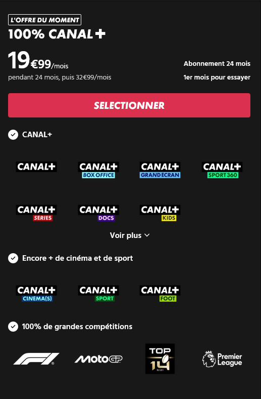 L’offre « 100% CANAL+ » revient, disponible chez Free, en OTT et chez tous les autres opérateurs. Cette dernière permet de profiter de l’ensemble des chaînes de l’univers CANAL+ pour 19,99 € par mois pendant 24 mois, avec un engagement de deux ans. À l’issue de cette période, le tarif passe à 32,99 € par mois. Le premier mois est proposé sans engagement, “pour essayer” afin de permettre aux nouveaux abonnés de tester le service. L’abonnement inclut les chaînes principales telles que CANAL+, CANAL+ Box Office, Grand Écran, Sport 360, Séries, Docs et Kids, ainsi que des chaînes supplémentaires axées sur le cinéma et le sport comme CANAL+ Cinéma(s), Sport et Foot.
