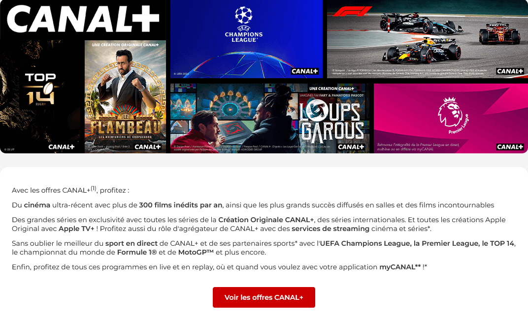 Cette offre donne accès à une large gamme de contenus, mêlant films récents, séries originales, documentaires, programmes jeunesse et événements sportifs. Elle inclut également la diffusion de grandes compétitions internationales telles que la Formule 1, le MotoGP, le Top 14 ou encore la Premier League. A noter, le pass divertissement est inclus pendant 2 mois, mais devra être désactivé sauf si vous souhaitez payer 10€ de plus par mois.