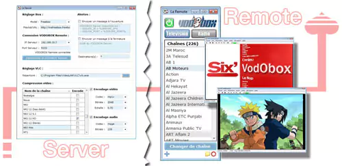 Ce model novateur de personal “VoD” est composé de deux logiciels distincts. Le VODOBOX Server (figure 1, à gauche) relaye le flux vidéo et audio de la Box sur votre réseau local, tandis que la VODOBOX Remote (figure 1, à droite) propose aux utilisateurs distant de regarder et de changer simplement de chaines de télés.