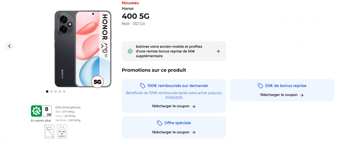 Free Mobile propose le très récent Honor 400 5G avec plusieurs promotions, allant de l’offre de remboursement à des cadeaux directement. Vous pouvez en effet profiter directement de 100€ de remboursement, de 50€ de bonus reprise et d’une offre spéciale de lancement pour ce modèle, vendu 579€ au comptant. Il est également possible d’étaler le paiement, pour payer 101€ à la commande puis 16.99€/mois pendant 24 mois, avec une option d’achat à 70€