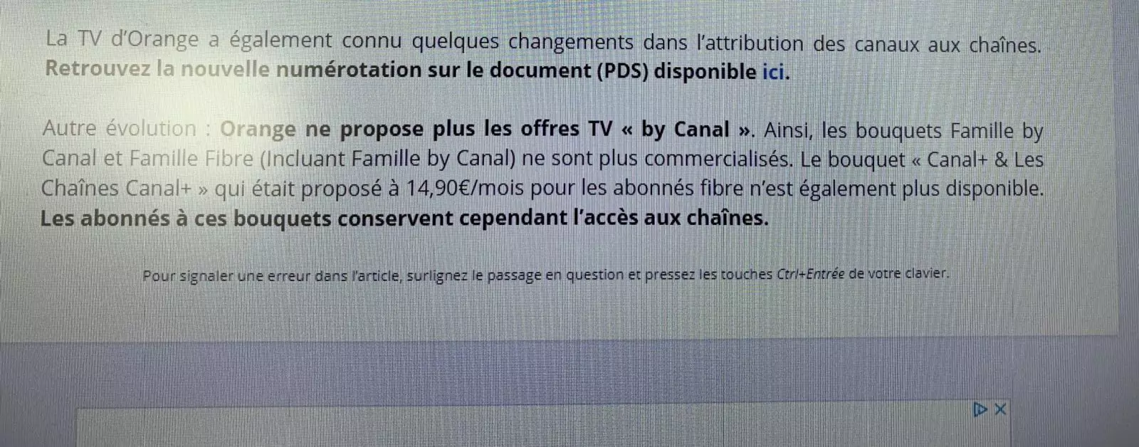 Free fut suivi par Orange, qui proposait le bouquet Famille by Canal pour 12,90€ (qui n’intégrait pas les chaînes de sport) et par Bouygues Télécom qui proposait un mini bouquet Canal avec uniquement quelques chaînes. Bouygues Télécom avait déjà stoppé cette offre et c’est maintenant au tour d’Orange d’annoncer la fin de la commercialisation de ses offres “by Canal”. Les abonnés actuels à cette option peuvent cependant continuer à en bénéficier
