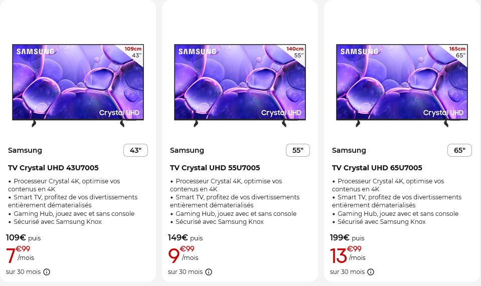 - 43 pouces (43U7005) : 109 € à la commande, puis 7,99 €/mois pendant 30 mois