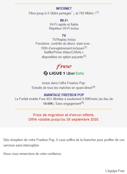 Certains abonnés Freebox mini 4K reçoivent un e-mail de la part de Free leur proposant de migrer gratuitement vers la Freebox Pop présentée début juillet. Pour eux, les frais de migration et d’envoi sont offerts jusqu’au 30 septembre.