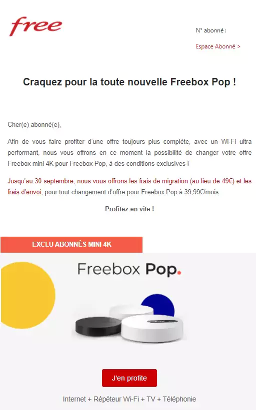 Certains abonnés Freebox mini 4K reçoivent un e-mail de la part de Free leur proposant de migrer gratuitement vers la Freebox Pop présentée début juillet. Pour eux, les frais de migration et d’envoi sont offerts jusqu’au 30 septembre.