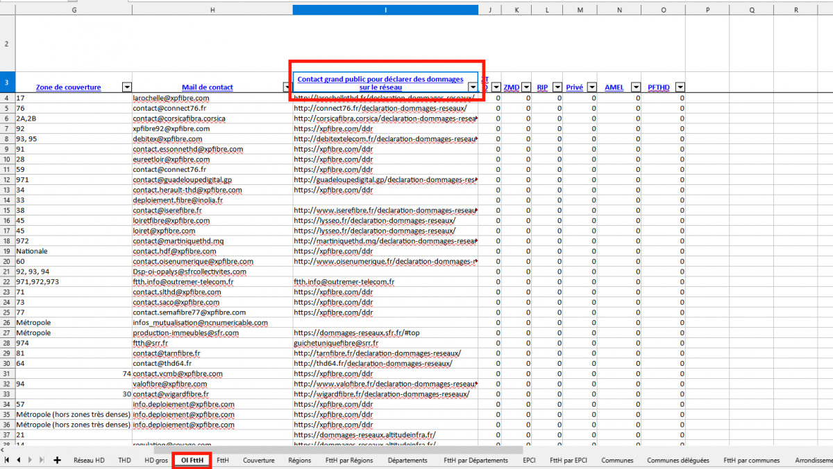 Si vous constatez des équipements détériorés sur la voie publique (poteau tombé, boîtier ouvert, fils arrachés…), il est possible de les signaler directement à l’opérateur d’infrastructure responsable du réseau dans votre zone. Pour identifier cet opérateur, rendez-vous sur le site Ma Connexion Internet dans l’onglet “déploiements fibre”. Vous pourrez ensuite retrouver le lien vers le formulaire de contact ou de déclaration de dommage pour chacun d’entre eux dans un fichier mis à disposition par l’Arcep (onglet “OI FttH”, colonne I).
