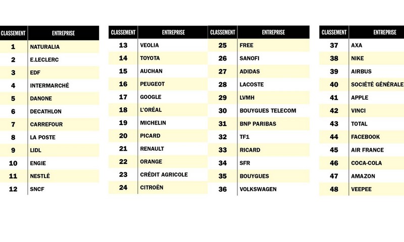 La première place revient à Naturalia, presque naturellement pour une enseigne positionnée sur le bio, à quoi s’ajoute sa politique de promotion en interne. La seconde place est occupée par Leclerc, qui revendique sans cesse sa mission d’aider les consommateurs et les agriculteurs. EDF ferme le podium, ayant visiblement réussi à convaincre avec son électricité verte.
