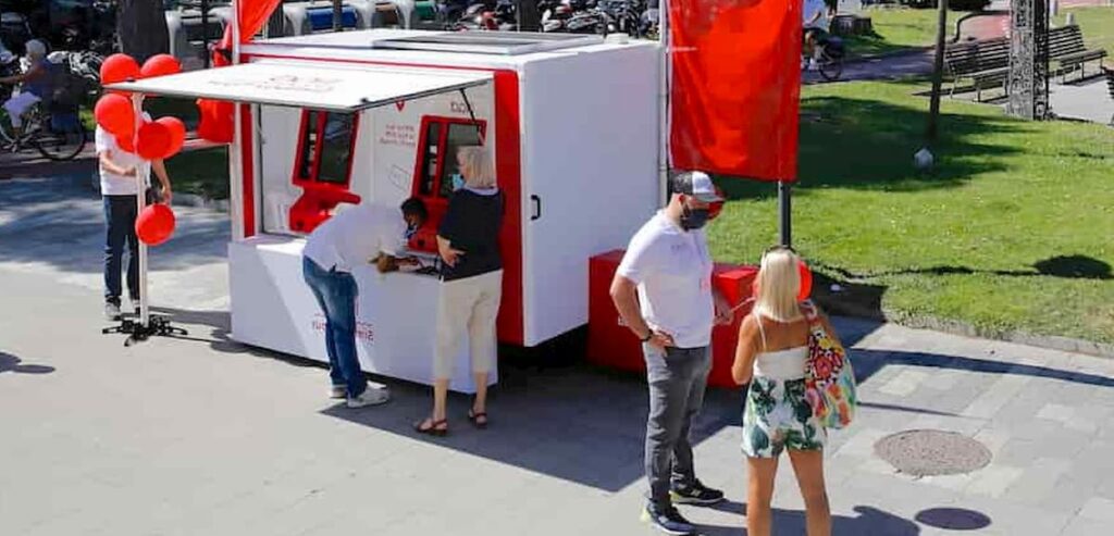 Le recrutement se déroule comme sur des roulettes en Italie, littéralement. L’opérateur fait ainsi sa réclame auprès des italiens en envoyant dans différentes villes un petit magasin atypique. Accompagnée de quelques conseillers qui informent les passants et promeuvent ses forfaits, cette petite caravane contient deux “SIMBox”, les bornes interactives italiennes, pour s’abonner aux offres d’Iliad Italia.