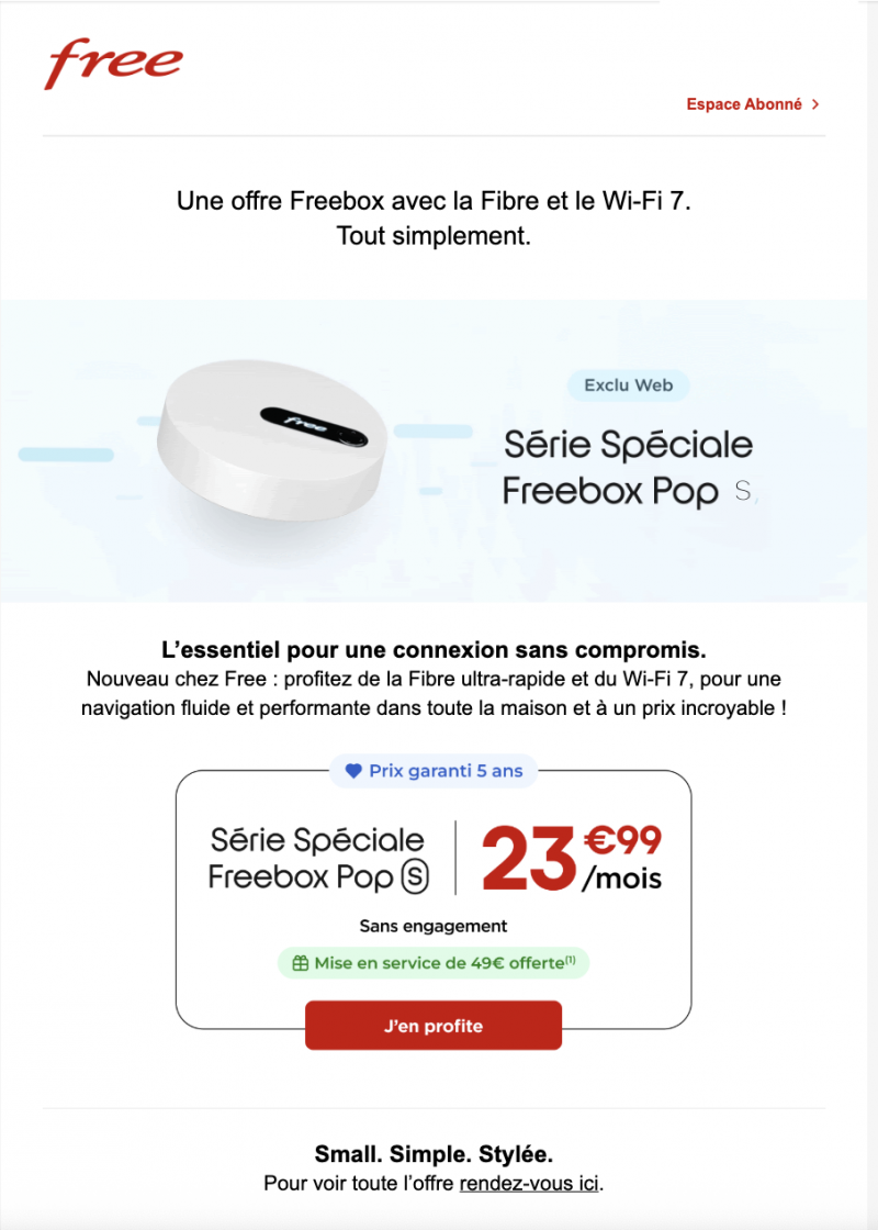 A l’heure où les opérateurs se livrent bataille sur les offres dualplay à moins de 25 euros, Free tente de séduire sa base d’abonnés mobile. Dans un email envoyé actuellement à ses clients, Free Mobile met en avant la « Série Spéciale Freebox Pop S ». Exclusivité web, cette offre internet sans TV est proposée à 23,99€/mois, sans engagement. Au cœur de la communication, Free souligne son « prix garanti 5 ans ». Pendant toute cette période, le montant mensuel de 23,99 € ne pourra pas augmenter, assurant aux abonnés une stabilité tarifaire rare sur le marché. De plus, les frais habituels de mise en service, habituellement facturés 49 €, sont offerts par l’opérateur (sur demande et via un remboursement), et ce pour toute souscription jusqu’au 12 juin.