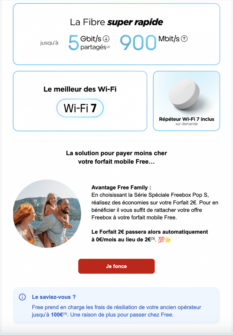 Free Mobile facilite enfin l’accès à cette offre en inscrivant un bouton clair “J’en profite” et “je fonce” dans son email. Pour ses clients qui seraient par ailleurs abonnés à un opérateur sur le fixe, Free rappelle le remboursement jusqu’à 100 euros des frais de résiliation.