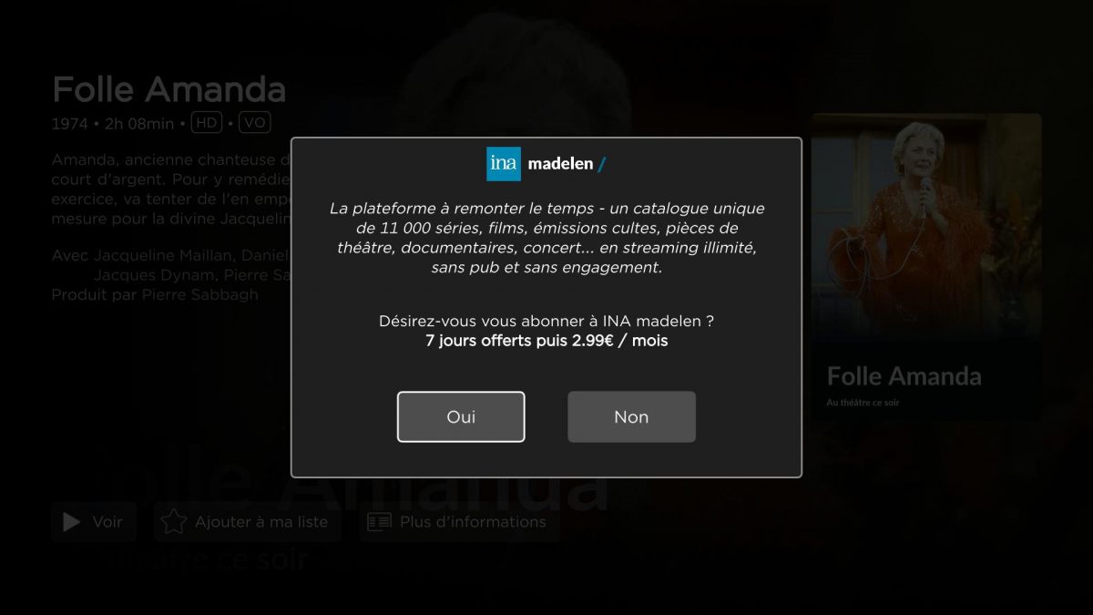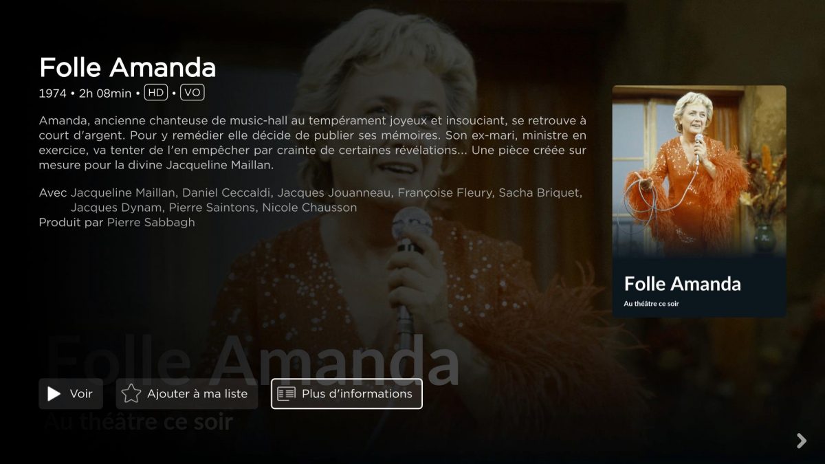 On peut cependant regretter que l’éditorialisation soit assez simpliste, il manque par exemple, à notre goût une suggestion de programmes similaires à celui que vous souhaitez regarder. L’intérêt de la plateforme reste avant tout son catalogue assez innovant : au menu, vous pourrez trouver près de 11 000 contenus, allant des séries cultes comme Les Rois Maudits, Maigret ou Chapeau Melon et Bottes de Cuir, aux classiques du cinéma comme Hiroshima mon amour ou Paris Texas, en passant par des émissions mythiques telles que Apostrophes, Strip Tease ou Dim Dam Dom… et bien plus encore.