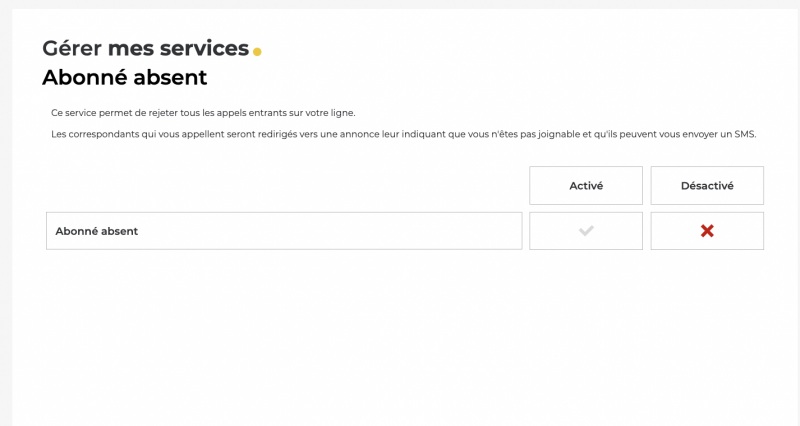 Accessible depuis l’Espace Abonné, dans la rubrique “Mon forfait mobile” > “Mes services”, ce service permet de rejeter automatiquement tous les appels entrants. Une fois activée, l’appelant entendra un message du type : « Free Mobile bonjour, votre correspondant n’est pas joignable, veuillez le rappeler ultérieurement. Vous pouvez aussi lui envoyer un texto. » Le message est ensuite répété en anglais avant que la communication ne soit coupée.