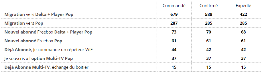Comme on peut le constater sur le site de freebox.toosurtoo, cette offre est celle qui rencontre proportionnellement le plus de succès, même davantage que l’offre Freebox Pop “classique”. Mais le revers de la médaille est que, comme le montre ces statistiques, c’est la seule offre a afficher des retards de livraison conséquents, principale en ce qui concerne les demandes de migrations. Pour les nouveaux abonnés, les choses vont un peu vite