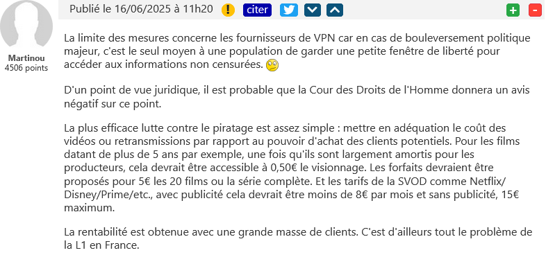 Alors que les initiatives pour lutter contre le piratage en ligne se multiplient à l’échelle européenne, les fournisseurs d’accès à Internet (FAI) expriment leurs préoccupations. Dans une déclaration adressée à la Commission européenne, l’association EuroISPA — représentant plus de 3 300 FAI — met en garde contre des mesures qu’elle juge disproportionnées et risquant de fragiliser l’écosystème numérique. La FFT appelle également à élargir la responsabilité à l’ensemble des acteurs numériques — moteurs de recherche, hébergeurs, fournisseurs de DNS ou de VPN — dans la lutte contre le piratage. Une solution qui n’est pas sans risque pour la sécurité des utilisateurs quelque ils soient, comme le rappelle un de nos lecteurs. La question du prix de l’offre légale peut également être un moyen de s’assurer que le piratage soit de moins en moins la solution privilégiée, notamment pour les foyers plus modestes.