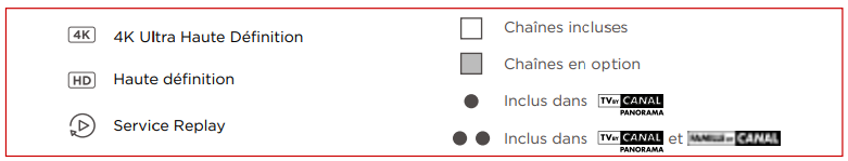 Sur ce document téléchargeable vous pouvez retrouver les chaînes du bouquet basic (en blanc) et celles en option (en gris). Il est par ailleurs indiqué pour chaque chaîne si elle propose un service de replay et si elle dispose d’une version en HD voire 4K.