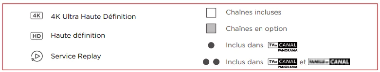 Sur ce document téléchargeable vous pouvez retrouver les chaînes du bouquet basic (en blanc) et celles en option (en gris). Il est par ailleurs indiqué pour chaque chaîne si elle propose un service de replay et si elle dispose d’une version en HD voire 4K.