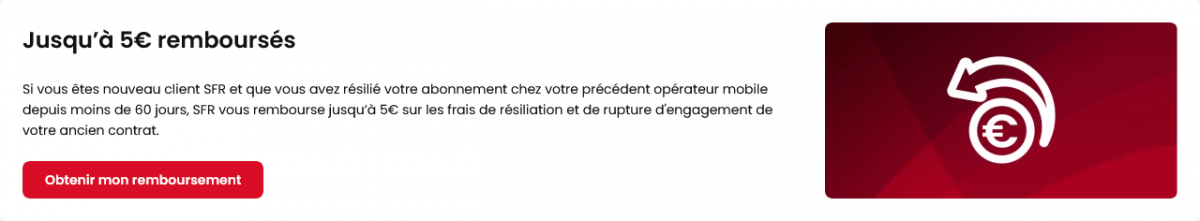 Depuis que Bouygues Telecom s’est mis à proposer des frais de résiliation sur ses forfaits mobiles, seul Free avait pris position en proposant une solution pour se les faire rembourser. Du moins, jusqu’à présent. Si vous venez de quitter votre ancien opérateur pour souscrire à une offre mobile SFR ou Red by SFR, vous pouvez désormais bénéficier du remboursement de vos frais de résiliation, qui sont pour l’heure inexistants chez les autres opérateurs que Bouygues Telecom. L’opérateur au carré rouge propose en effet jusqu’à 5 € remboursés, à condition d’avoir résilié votre précédent abonnement mobile depuis moins de 60 jours.