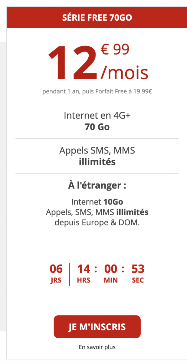 Après avoir baissé la quantité de data en roaming de son offre “Série Free” la semaine dernière sans changer son prix, l’opérateur décide aujourd’hui de rajouter 2 Go à l’étranger tout en diminuant de 10 Go la data incluse en France Métropolitaine. Cette fois, le tarif est revu à la baisse. Disponible jusqu’au 22 septembre, l’offre comprend désormais 70 Go dans l’hexagone, 10 Go en roaming sans oublier les appels, SMS et MMS en illimité. Le tout pour 12,99€/mois soit 1 euro de moins que la formule proposée précédemment.