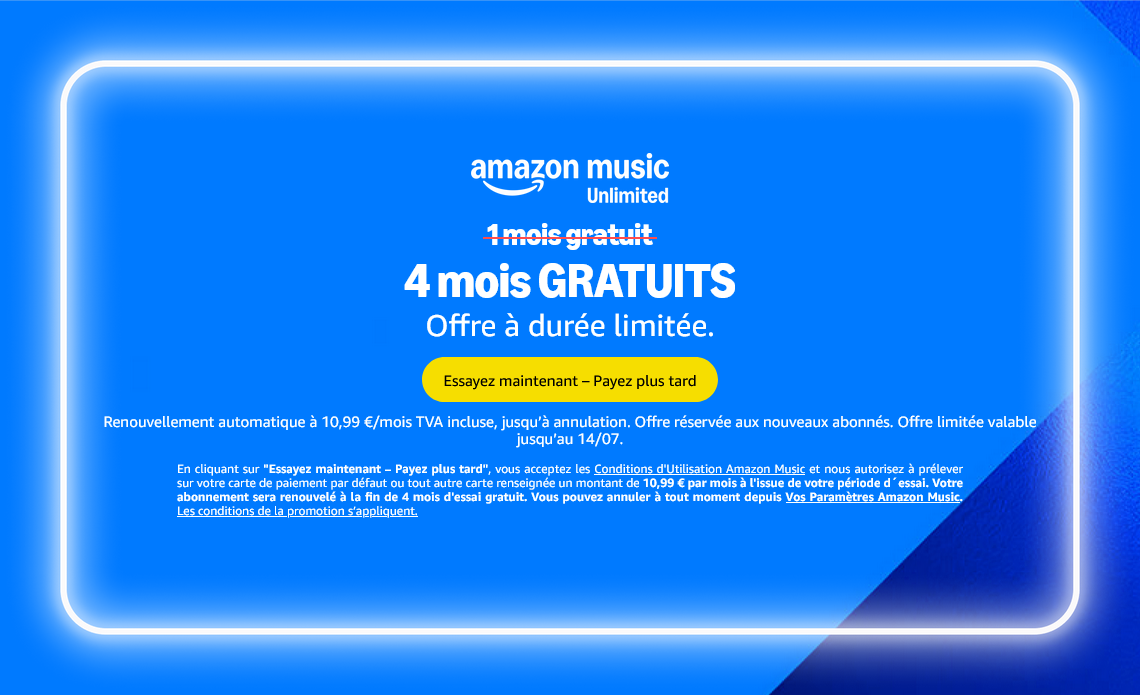 De quoi vibrer tout l’été, avec plus de 100 millions de titres sans publicité et à la demande, des podcasts, plus de 850 000 livres audio… Gratuitement pendant 4 mois. Amazon Music Unlimited est actuellement en promotion jusqu’au 14 juillet prochain, avec une offre résolument alléchante.
