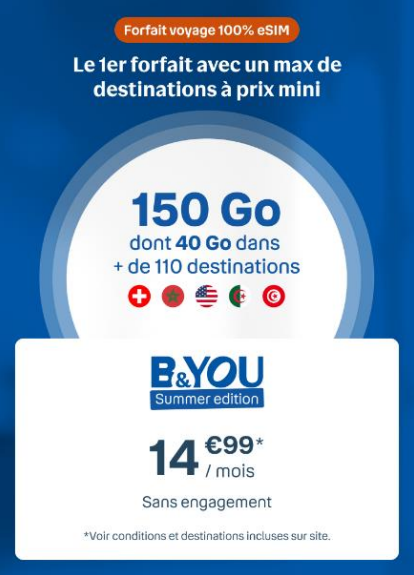 À l’approche de la période estivale, B&YOU, la marque digitale de Bouygues Telecom, annonce le lancement de « Summer Edition », un nouveau forfait mobile entièrement dématérialisé. Une opération qu’il avait déjà lancée en 2023. Annoncée ce 23 juin 2025, cette offre sans engagement s’appuie exclusivement sur la technologie eSIM et se positionne comme une solution flexible pour les voyageurs réguliers.