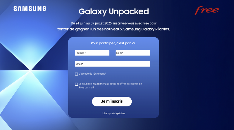 “Du 24 juin au 09 juillet 2025, inscrivez-vous avec Free pour tenter de gagner l’un des nouveaux Samsung Galaxy Pliables”, à l’occasion de l’annonce du Galaxy Unpacked 2025 qui révèlera le mois prochain les nouveaux Galaxy Z Fold 7 et Z Flip 7, Free et le géant sud- coréen lancent un concours.