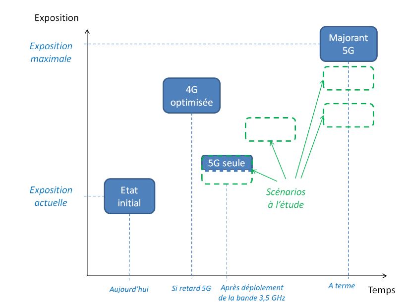Quatre scénarios ont fait l’objet d’une simulation de l’ANFR, après avoir consulté plusieurs équipementiers et opérateurs télécoms pour une expérience le plus proche du réel. Le premier cas de figure, nommé “Etat initial“, correspond à la situation actuelle des réseaux mobiles sur cette zone. Le deuxième cas, “4G optimisée“, simule une situation où la majorité des émetteurs 2G et 3G ont été convertis à la 4G, avec cette génération déployée sur toutes les bandes de fréquences. Autre scénario : “5G seule“, qui mesure l’exposition produite par la mise en service de la 5G sur la bande des 3.5GHz avec des antennes a faisceaux orientables. Et enfin le cas “Majorant 5G“, qui combine les deux dernières situations, ne sera “sans doute jamais mis en oeuvre”, puisque le déploiement de la dernière génération de téléphonie mobile ne permettra pas l’optimisation de la 4G.