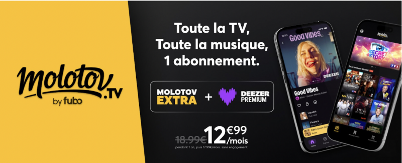 Proposée au tarif de 12,99 €/mois pendant 12 mois (puis 17,99 €/mois), l’offre Molotov Extra + Deezer Premium représente une économie de près de 30 % par rapport à deux abonnements distincts souscrits séparément, le tout sans pub, sans engagement et sur tous les écrans. C’est une solution pour regarder la télévision “sans box TV et sans forfait onéreux auprès d’un opérateur”, indique Molotov. Un forfait mobile riche en data peu suffire tout comme une offre dual play comme la Freebox Pop S de Free.
