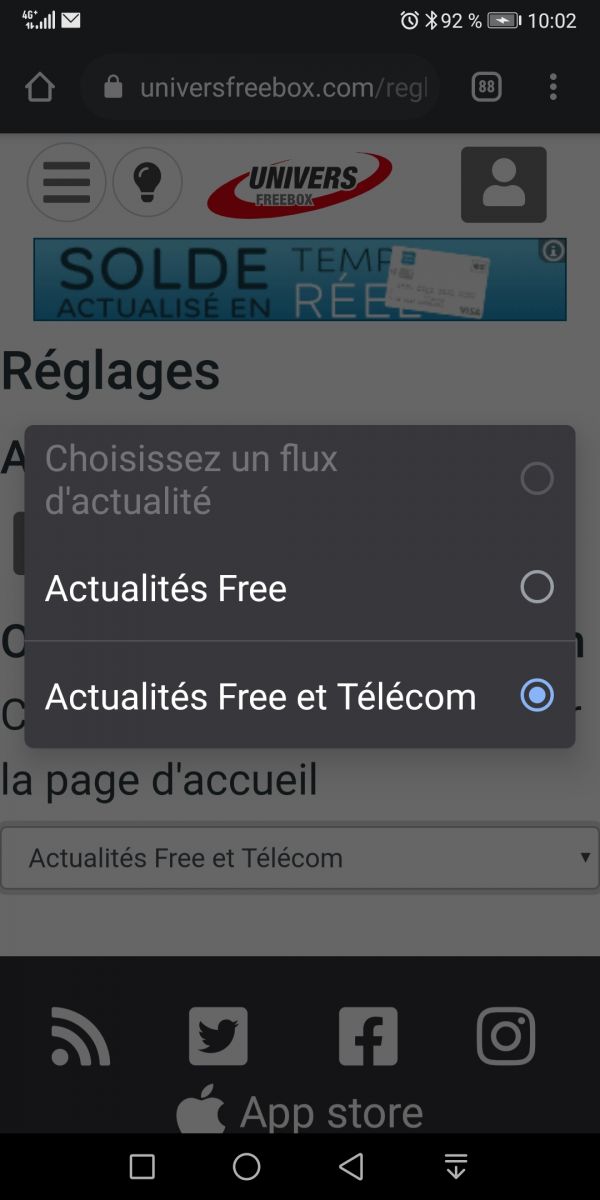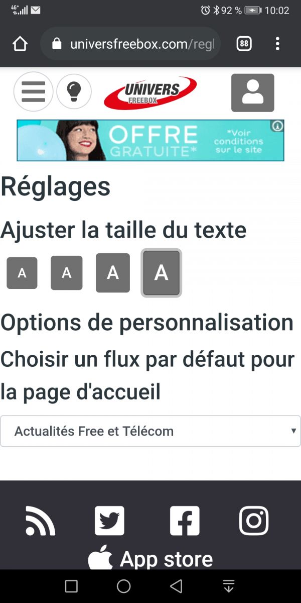 Il est désormais possible de choisir quelle rubrique sera chargée par défaut sur la page d’accueil mobile. Vous avez le choix entre “Actualités Free” qui permet de visualiser les articles les plus axés sur Free. Ou la rubrique “Actualités Free et Télécom” qui permet d’avoir les informations sur Free couplées à toutes les informations relatives aux Télécoms.